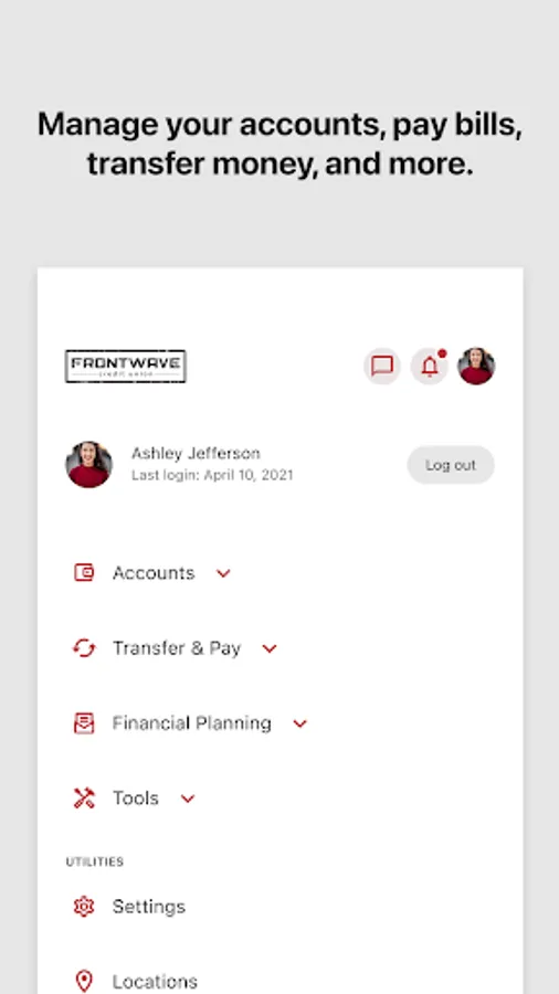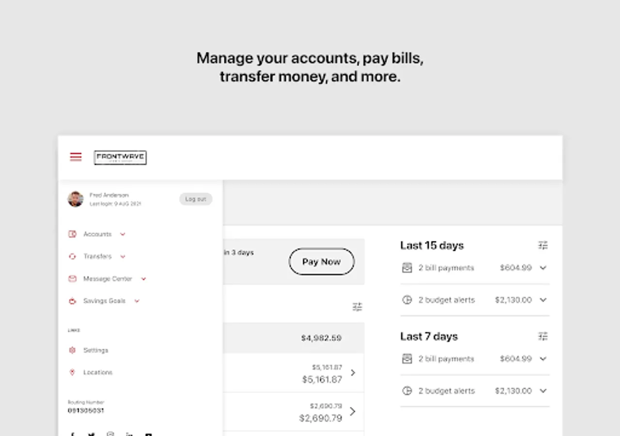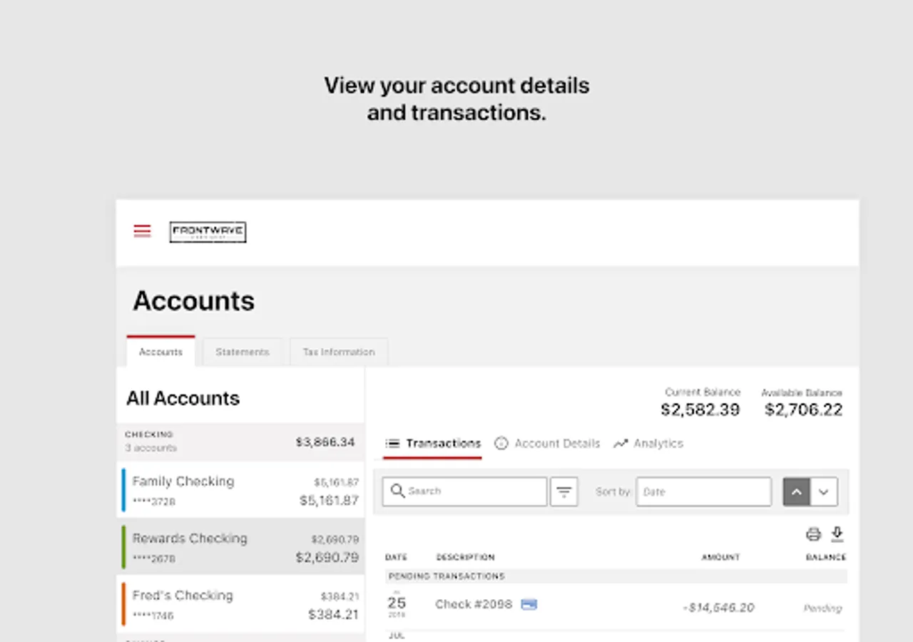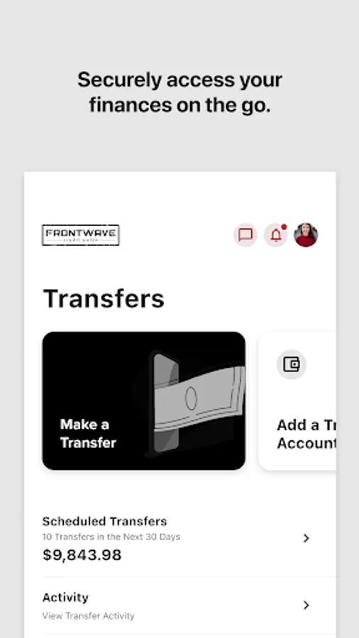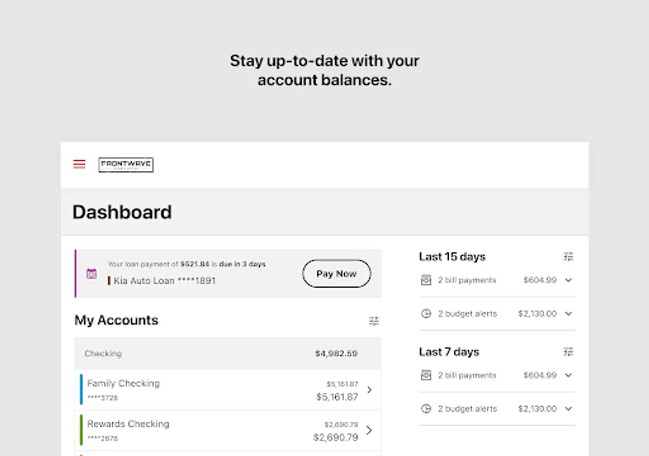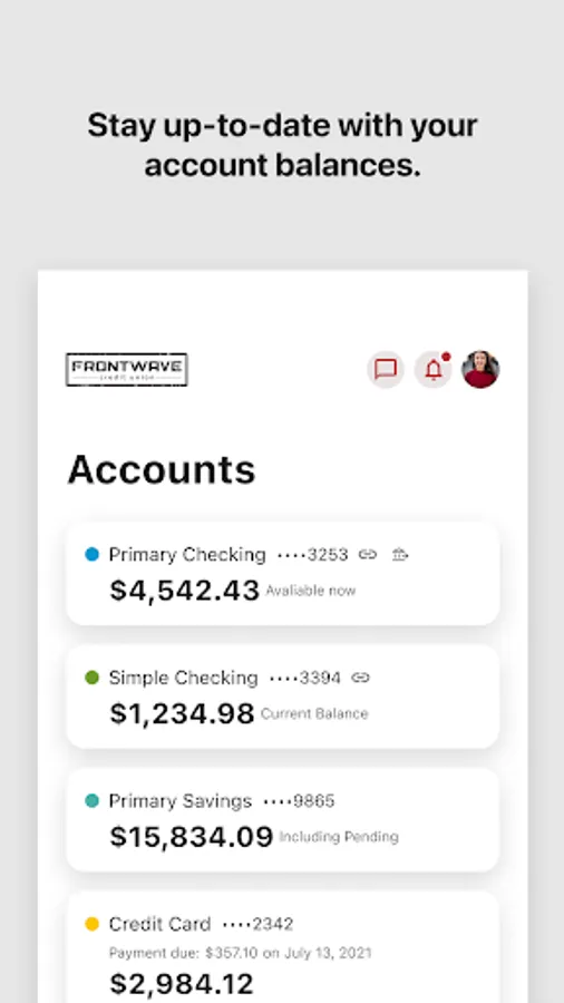 Frontwave Credit Union Mobile Banking allows you to check your balance, view your transaction history, transfer funds, pay bills, deposit checks, find a branch or ATM in your area, and more! And here's the best part...it's FREE!!