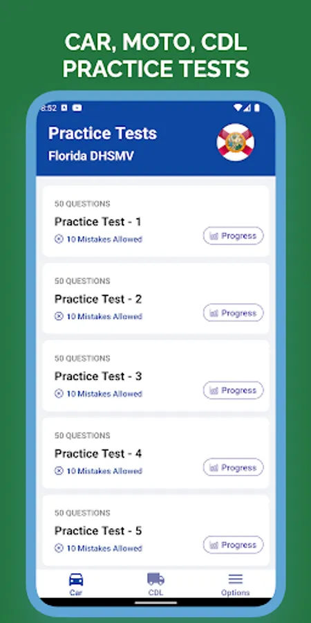 In addition to its comprehensive study guide and practice questions, the Florida DMV Driving License Permit Test Preparation 2023 App also provides you with detailed simulations of the actual DMV exam. These simulations allow you to see what the exam will be like, and to practice your driving skills in a realistic environment. You'll be able to see how you perform on each simulation, and get feedback on your driving skills, so you can be sure that you're ready for the real thing. This app includes questions based on official Florida DMV state manual. The app allows you to prepare and practice for the Car, Motorcycle and Commercial Driving license (CDL) driver’s license permit test for Florida State and all practice tests are based on the latest manuals.