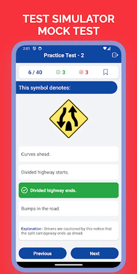 * Extensive Question Bank: The app contains a vast database of practice questions meticulously designed to cover all aspects of the test. Our app contains questions on topics such as road signs, traffic laws, safe driving practices, and more.