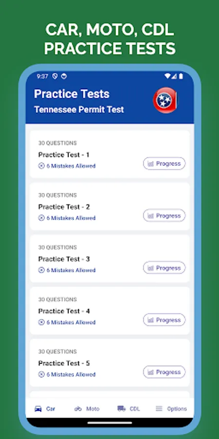 Are you preparing for learners permit test or drivers permit test for the state of Tennessee? Our user-friendly app , “Tennessee Driving Permit Test" allows you to practice questions, ensuring you're well-prepared and pass the test easily. The app serves as a study guide for your upcoming TN permit test.