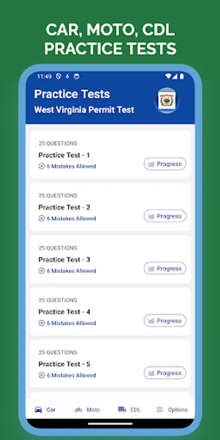 Are you preparing for learners permit test or drivers permit test for the state of West Virginia? Our user-friendly app , “West Virginia Driving Permit Test" allows you to practice questions, ensuring you're well-prepared and pass the test easily. The app serves as a study guide for your upcoming WV permit test.