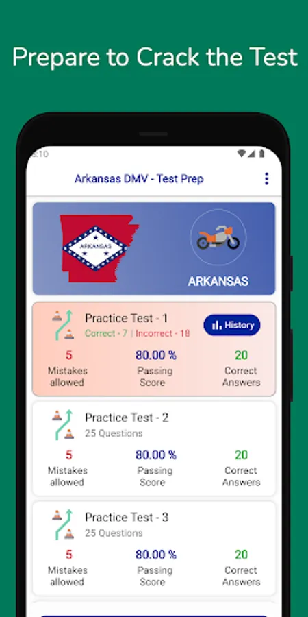 The Arkansas DMV permit test was considered when developing this app. It makes DMV exam preparation quick and easy. It can be used to speed up studying or as a study guide. This app gives you questions and answers that you can use to improve your score.