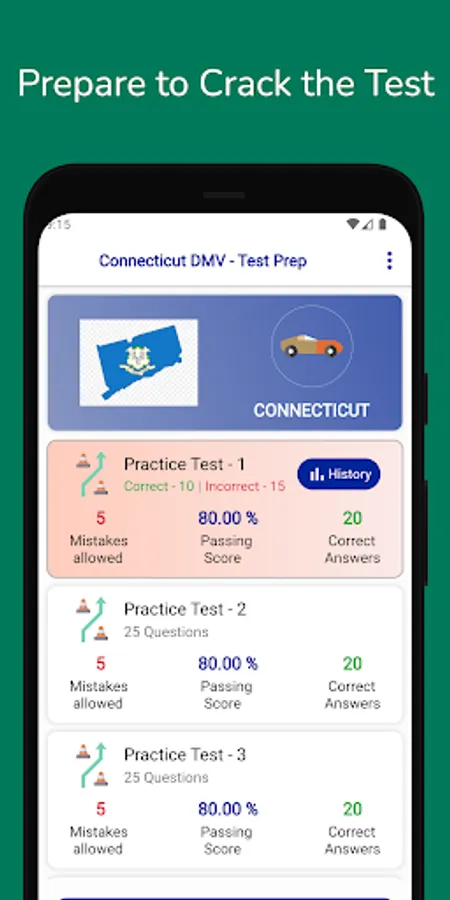 The Connecticut DMV permit test was considered when developing this app. It makes DMV exam preparation quick and easy. It can be used to speed up studying or as a study guide. This app gives you questions and answers that you can use to improve your score.