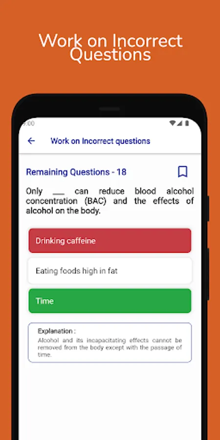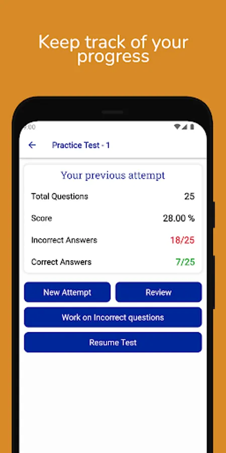 Take the practice exams at your own pace, and never worry about losing your place again with the option to resume unfinished tests. Bookmark the questions you need to review later, or focus on your areas of improvement by working on all the incorrect questions.