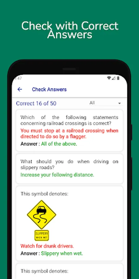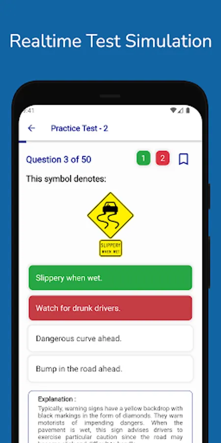 Keep track of your performance on practice exams. The practice test has a lot of questions to help you get ready for your driving, motorcycle, and CDL license exams. simple, uncluttered user interface.