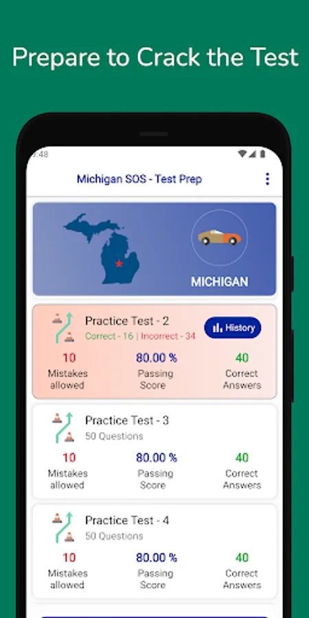 The Michigan SOS permit test was considered when developing this app. It makes DMV exam preparation quick and easy. It can be used to speed up studying or as a study guide. This app gives you questions and answers that you can use to improve your score.