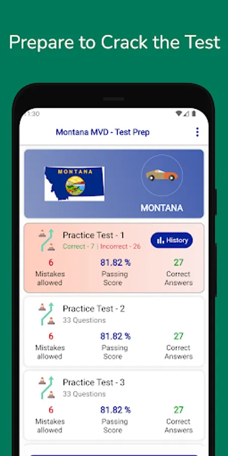 The Montana MVD permit test was considered when developing this app. It makes DMV exam preparation quick and easy. It can be used to speed up studying or as a study guide. This app gives you questions and answers that you can use to improve your score.