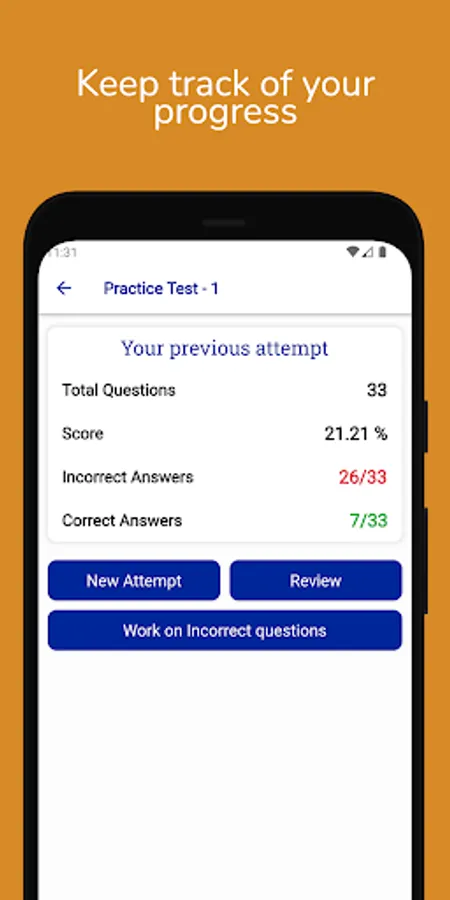 Take the practice exams at your own pace, and never worry about losing your place again with the option to resume unfinished tests. Bookmark the questions you need to review later, or focus on your areas of improvement by working on all the incorrect questions.