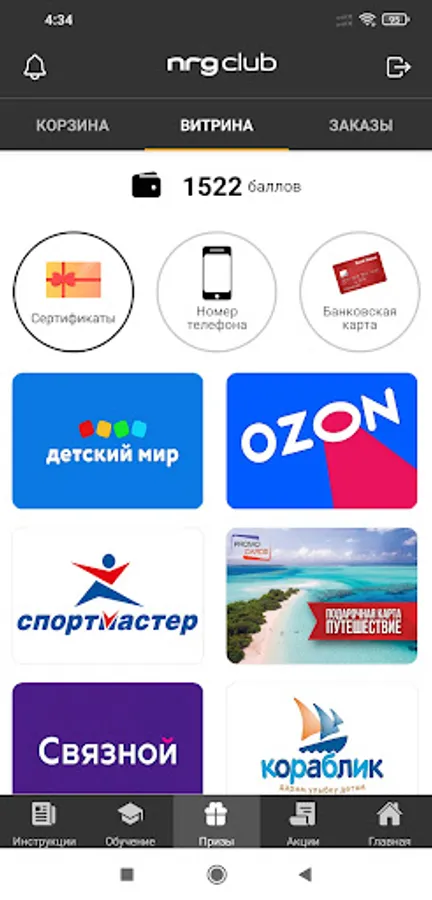 • exchange of points for gifts and cash (electronic certificates of stores, payment for mobile communications, transfer of money to a bank card).