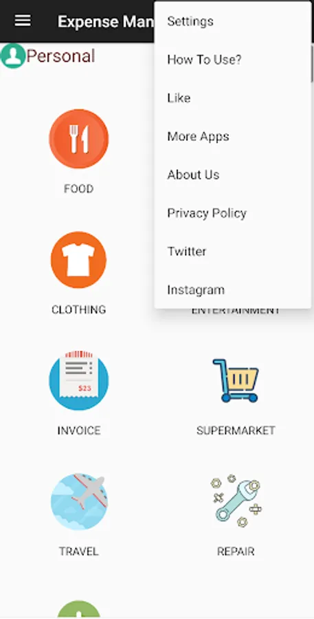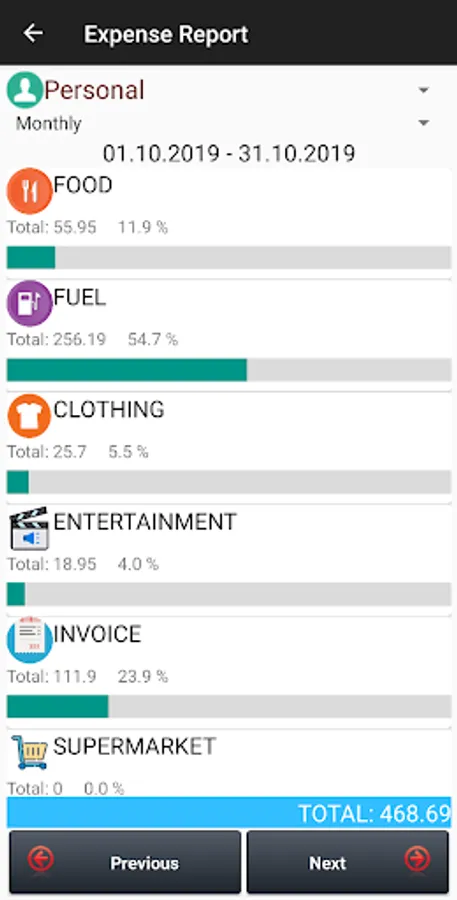 In Report page, you can see daily, weekly, monthly and all time expense details.