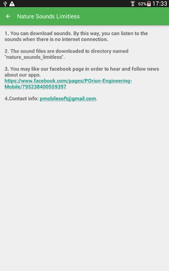----INTERNET IS REQUIRED BECAUSE THE SOUND FILES ARE STREAMED FROM INTERNET. ONCE YOU LISTEN TO ONE SOUND, IT WILL BE DOWNLOADED AND NO MORE INTERNET IS REQUIRED.----