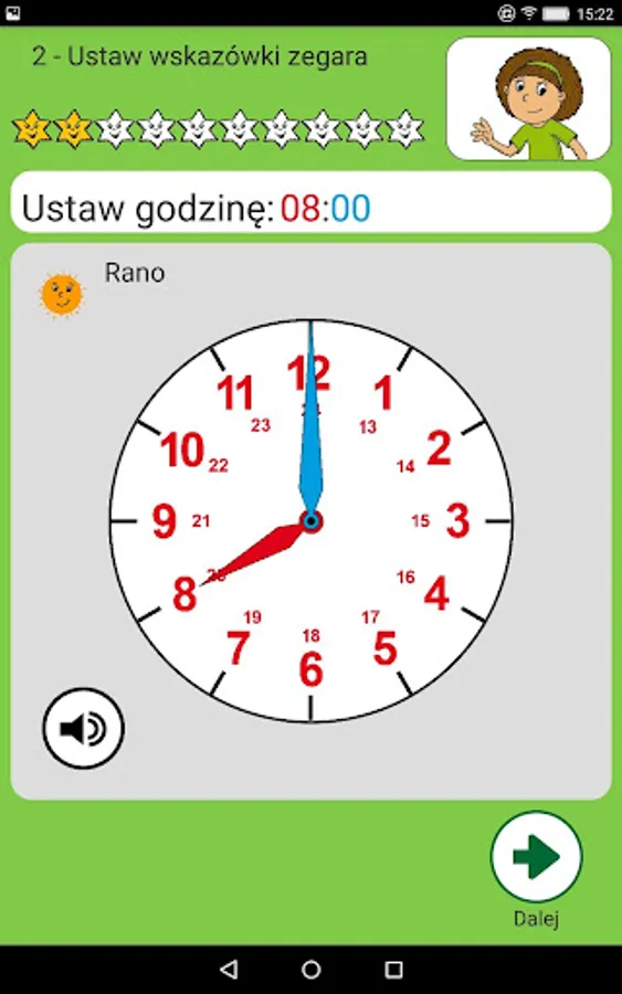 "Learning hours on a children's clock" contains 7 lessons (levels). Each lesson consists of a training part and games. Application for children aged 5 - 9 years. A clock for a child.