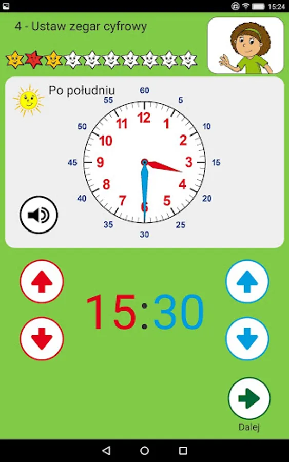 5.2 Learning: "Reading minutes" - children press the button and watch how the time on the clock changes.