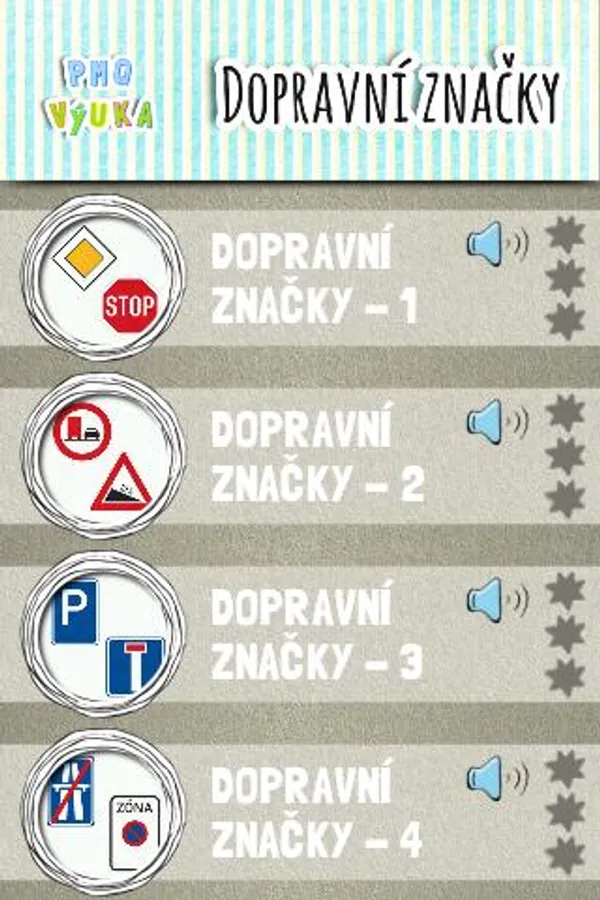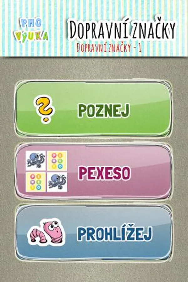 Contains speaking pexeso and view all traffic signs. Game POZNEJ stores the results of all the questions so you can practice a wrong answer for all past lessons.