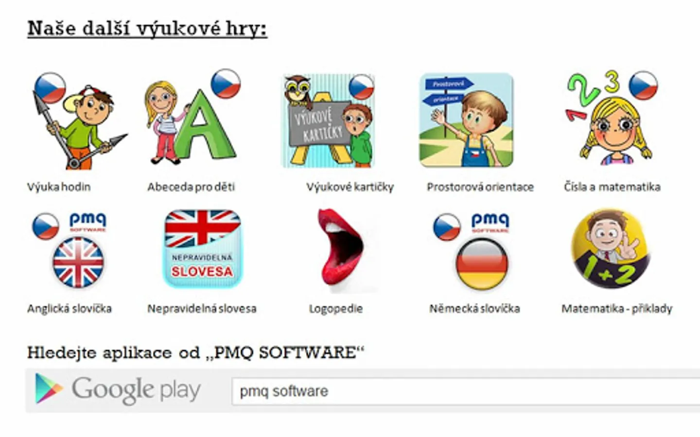 When you go on the road, so take along package our other applications - Learning flashcards, English and German vocabulary, teaching the alphabet and mathematics for children. For older children we Czech language and spelling of English irregular verbs. Search applications PMQ SOFTWARE.