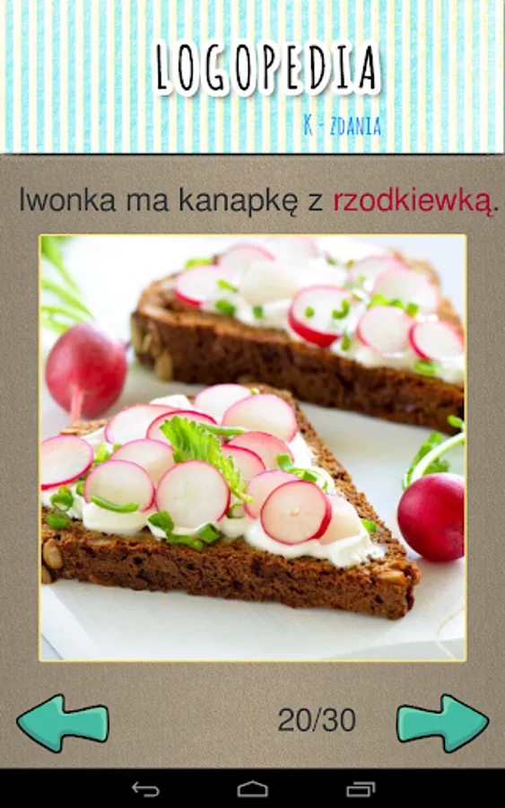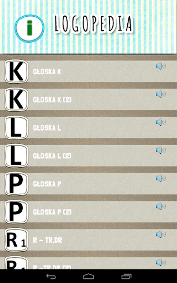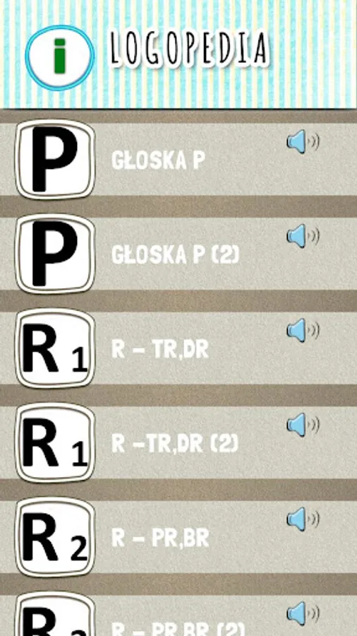 The speech therapy application contains articulation exercises for children at the stage of syllables, words, word associations and sentences for individual sounds. It can also be used when working with adults.