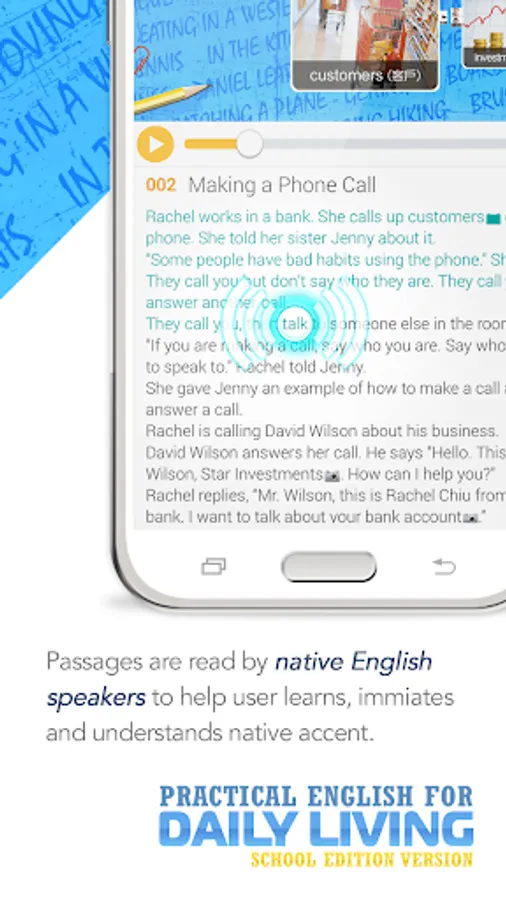 - Passages are read by native English speakers to help user learns, imitates and understands native accent.