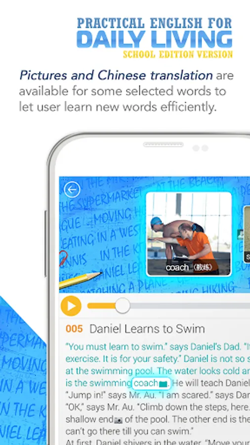 - Pictures and Chinese translation are available for some selected words to let user learn new words efficiently.