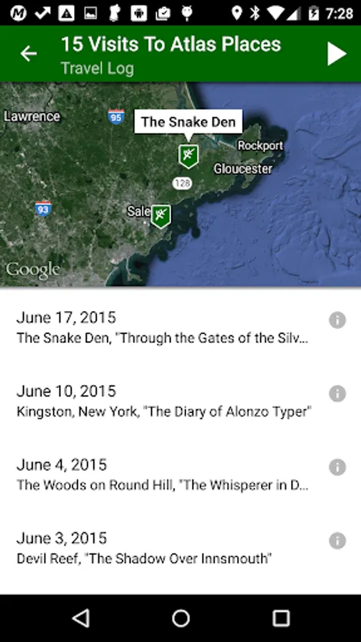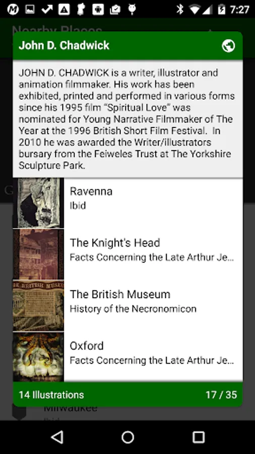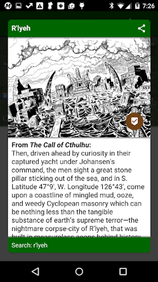 Use the Atlas to plan your next trip to the Plateau of Leng or look up the location of of the ill-fated Antarctic base camp during your next reading of "At the Mountains of Madness". Log your visit to Dunwich in the built-in Travel Log, and use the Nearby Places to find sites close by.