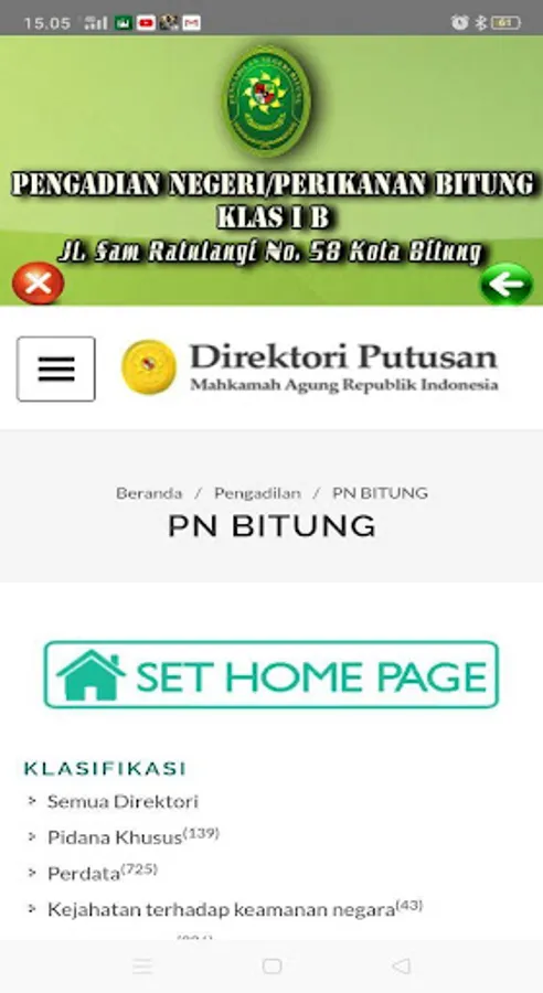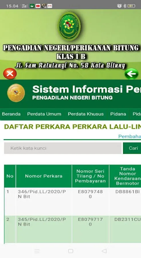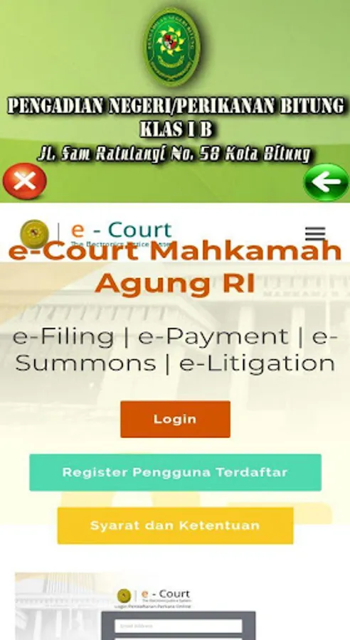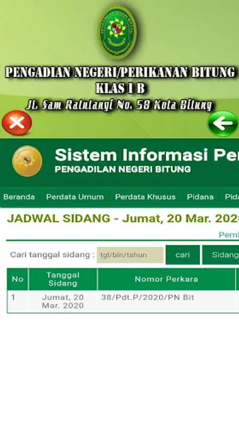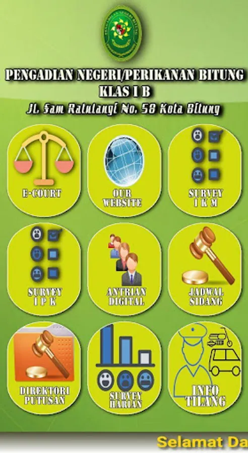 This application is a Panel of several applications used in the District Court / Fisheries Bitung Class 1B. through this application, it is expected that the public can access information in the Bitung District Court easily. Information that can be accessed includes information on the trial schedule, a link to enter the e-court application, a link for ticket information, a decision directory, and a Satisfaction Survey.