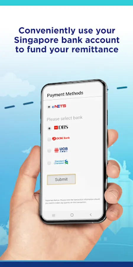 PNB Singapore Mobile App allows funding of your remittance transactions easily from any ENETS member banks including DBS/POSB, UOB, OCBC, and Standard Chartered Bank.