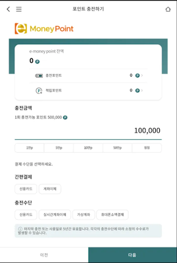 You can recharge e-money points through various payment methods such as credit cards and real-time account transfers.