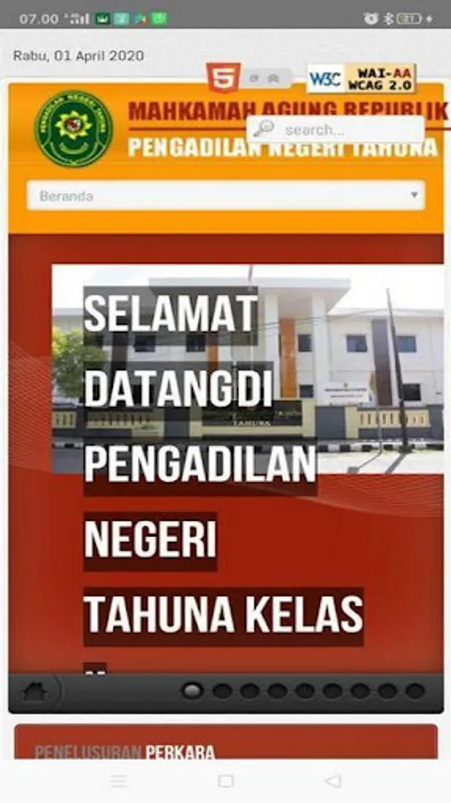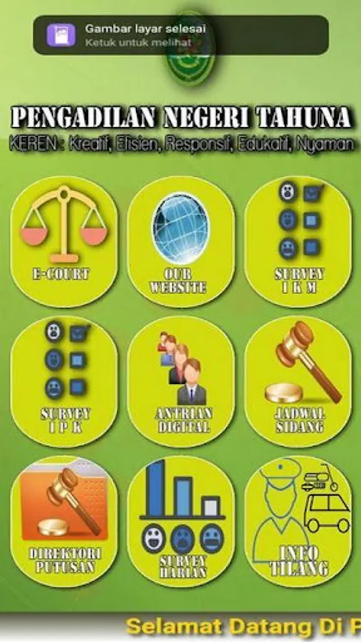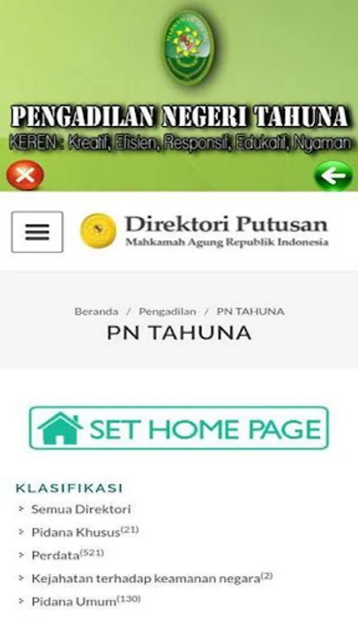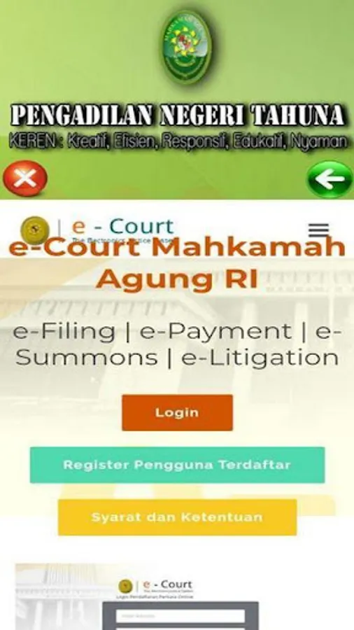This application is a Panel of several applications used in Tahuna District Court. through this application, it is expected that the public can access information in the Tahuna District Court easily. Information that can be accessed includes information on the trial schedule, a link to enter the e-court application, a link for ticket information, a decision directory, and a Satisfaction Survey.
