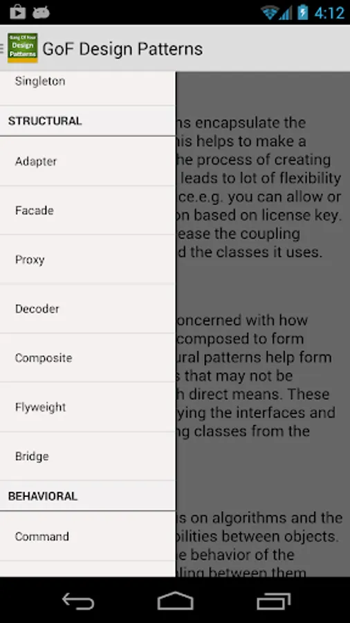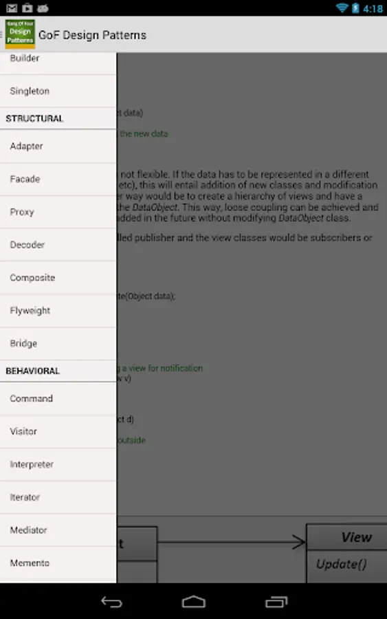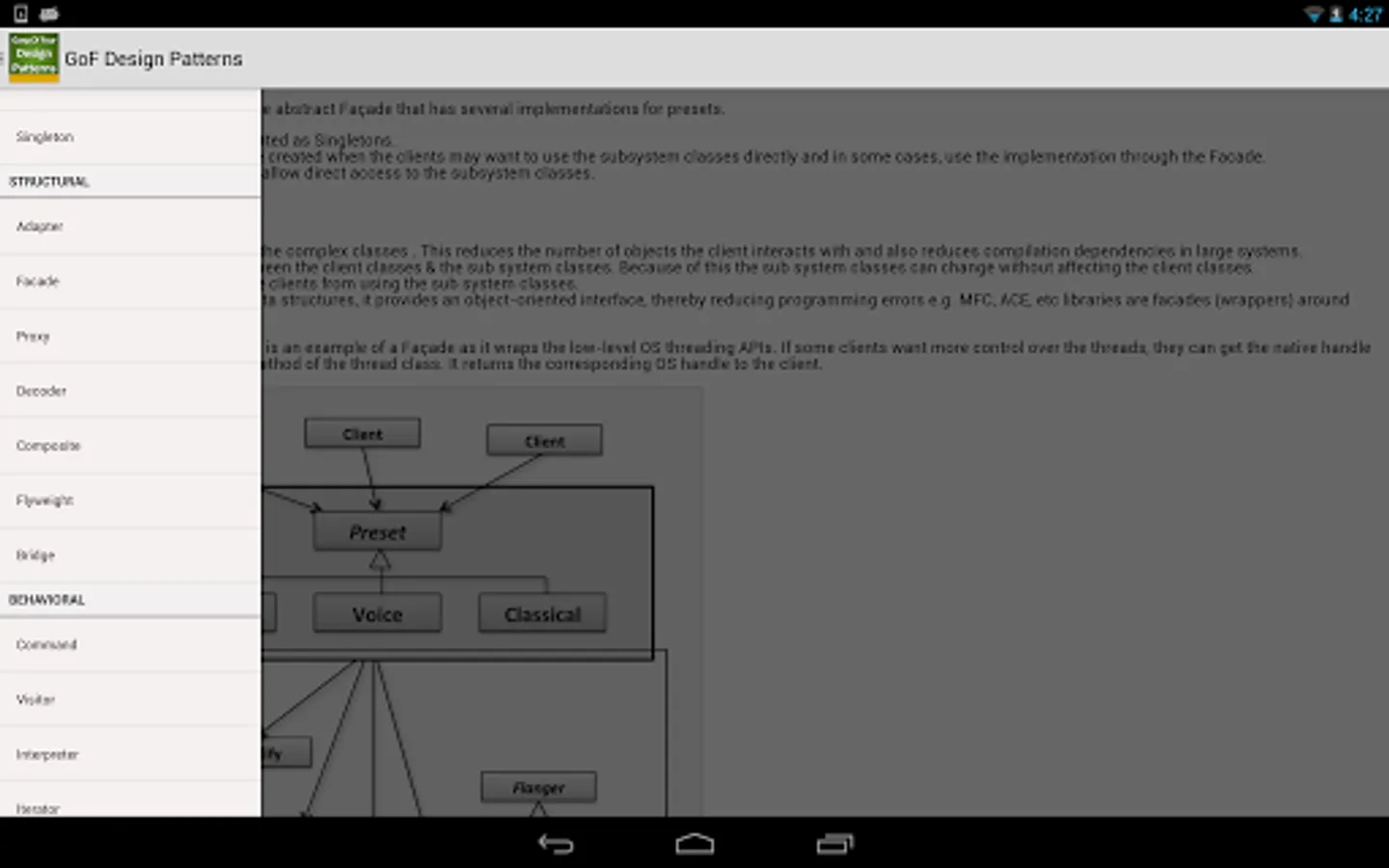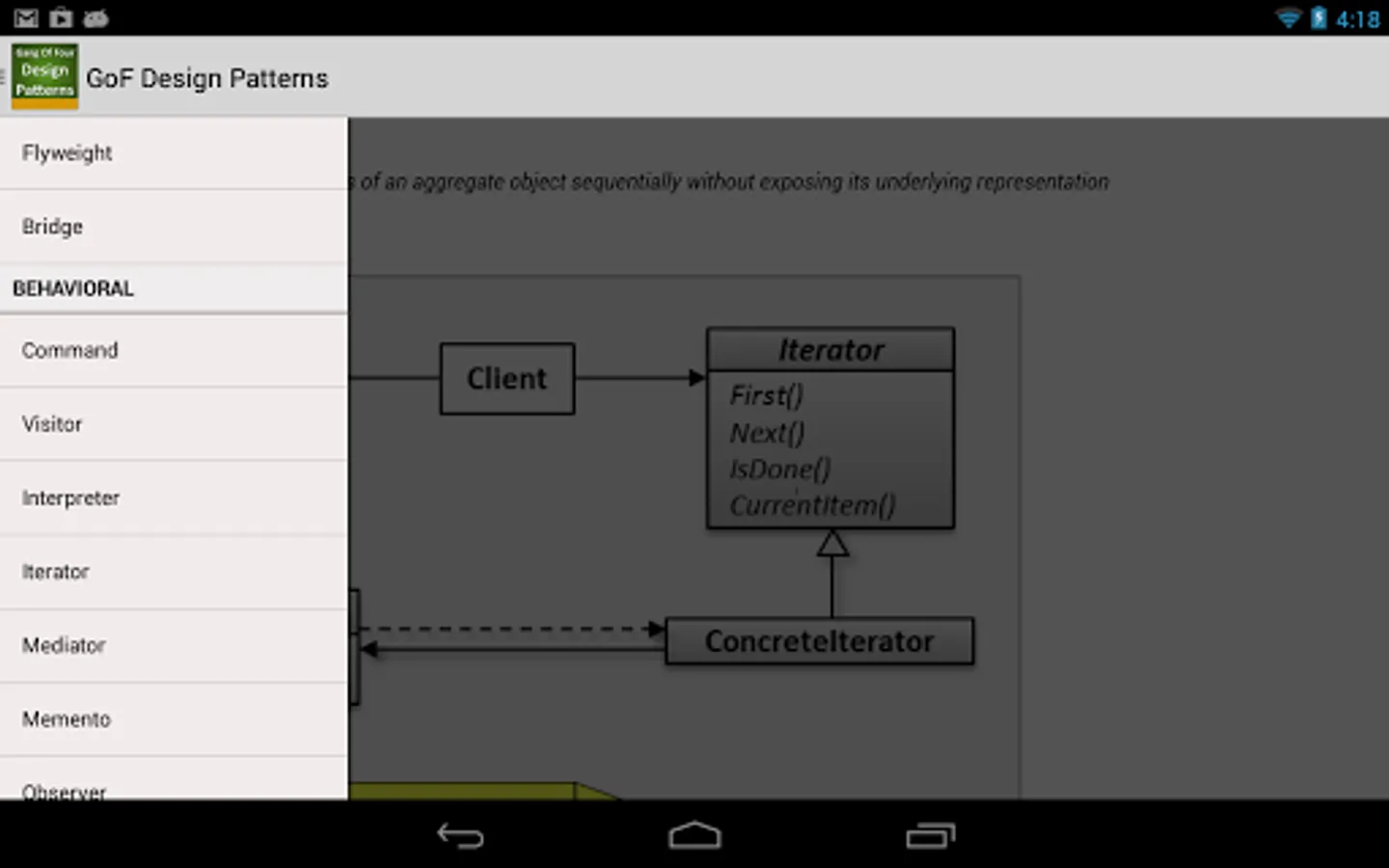 GoF Design Patterns application for Android is a highly distilled knowledge of Design Patterns and a great reference for on-the-go learning. It follows the style of the original design patterns book, with a few enhancements.