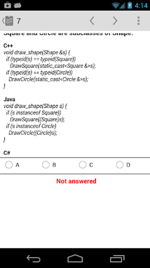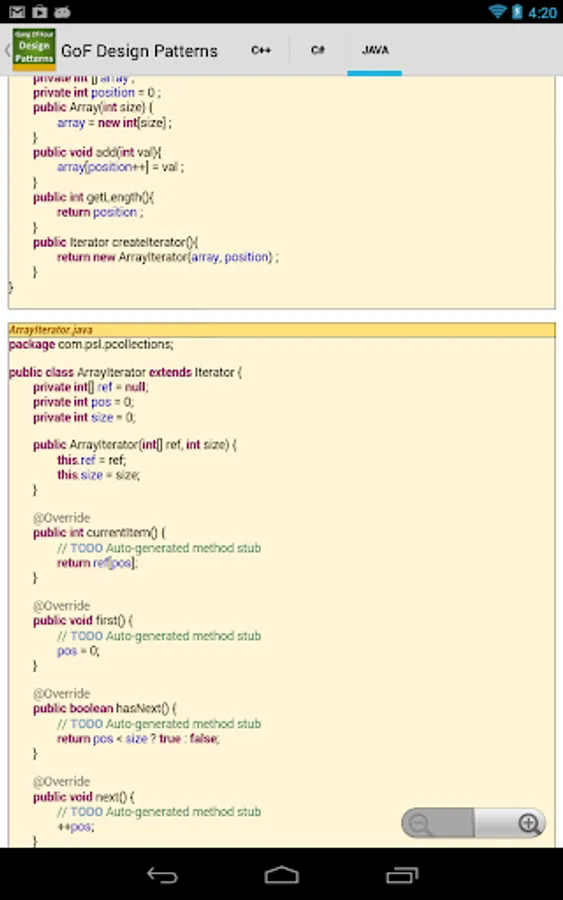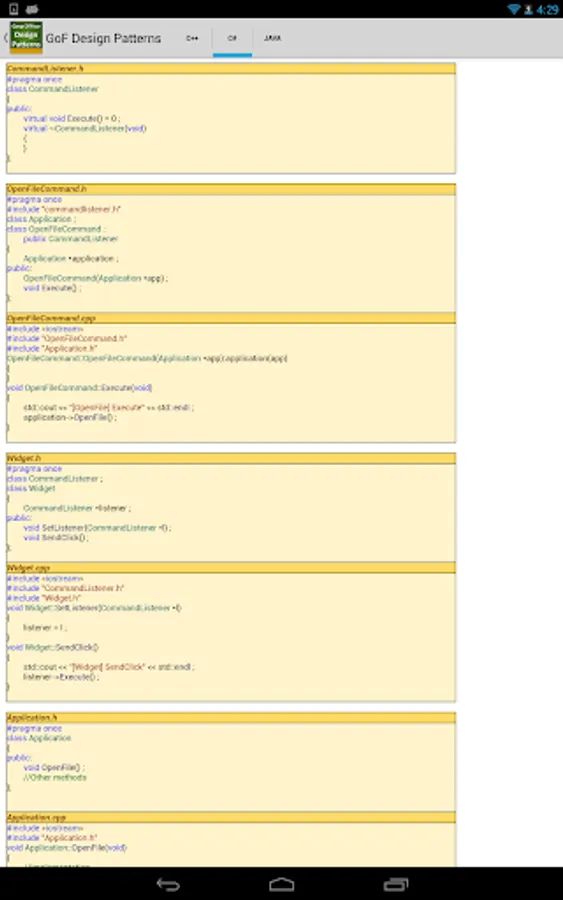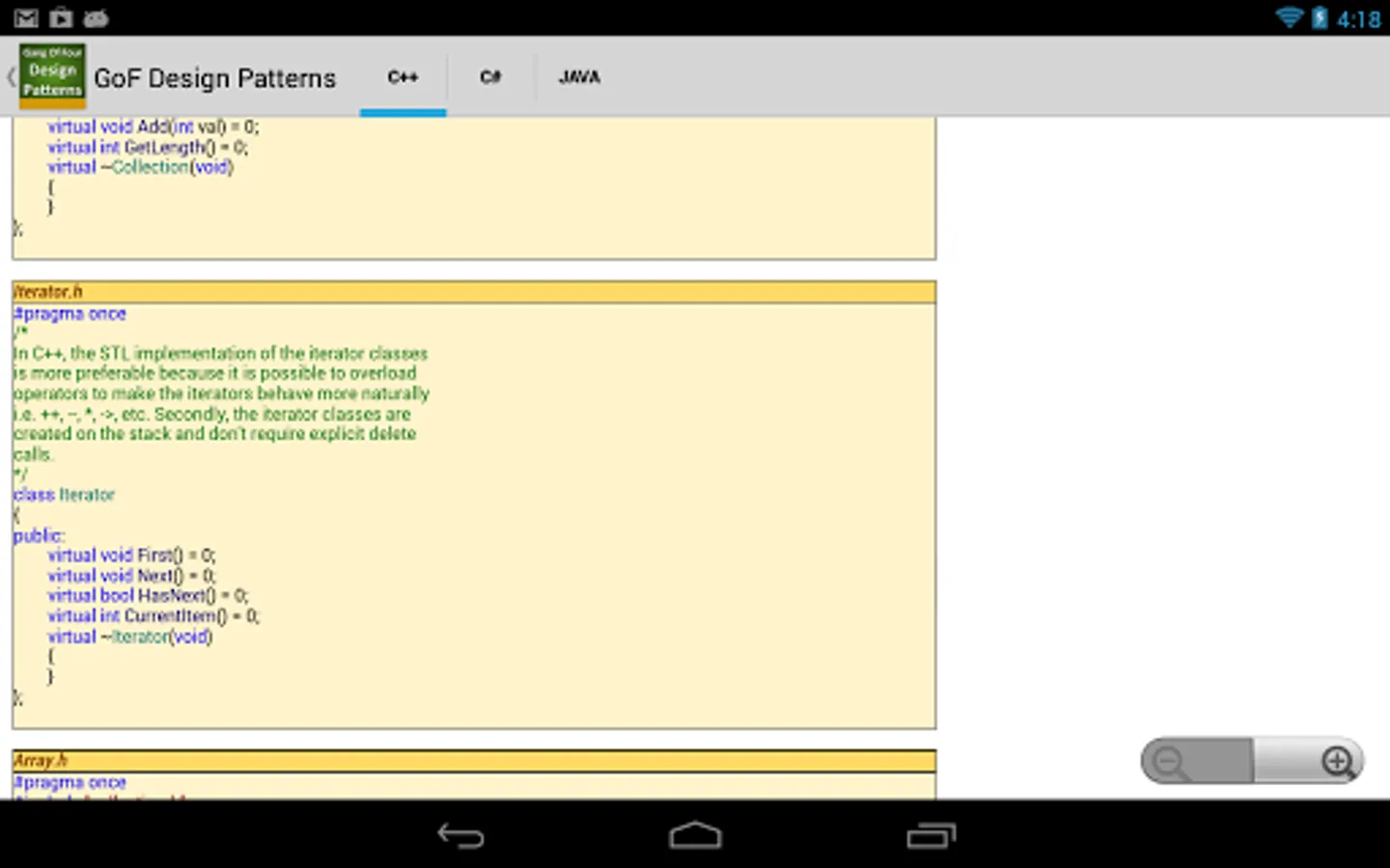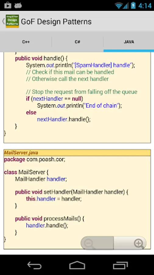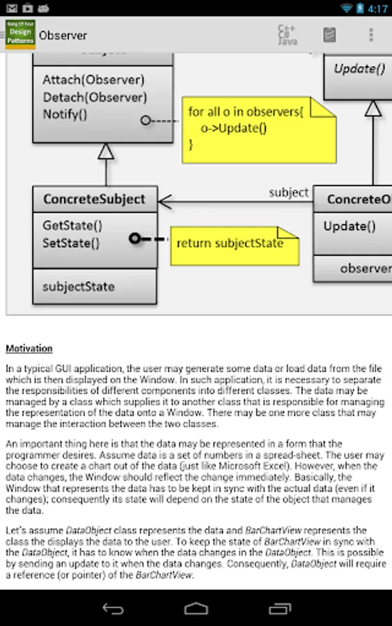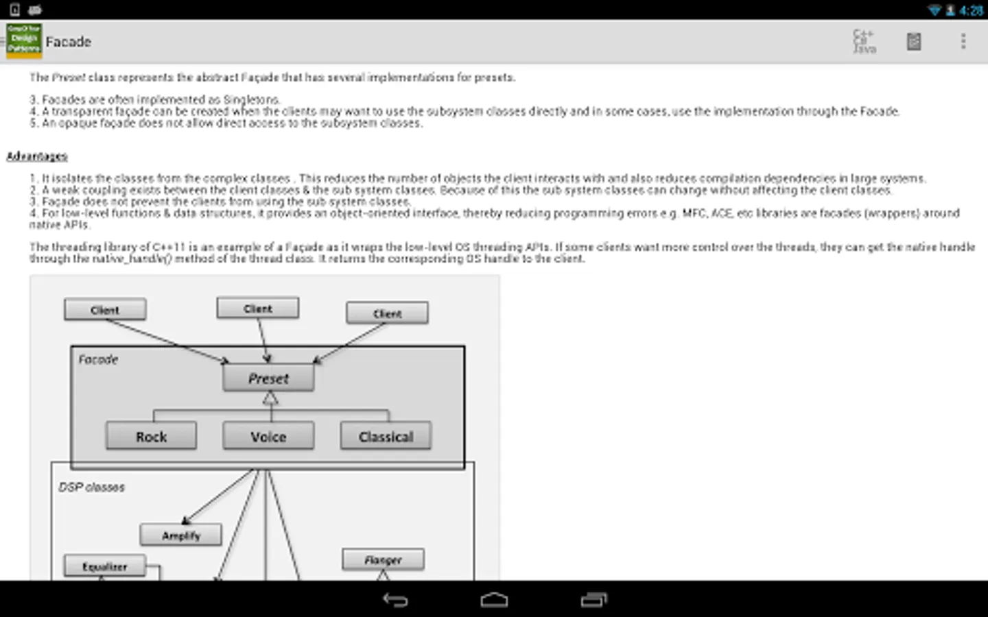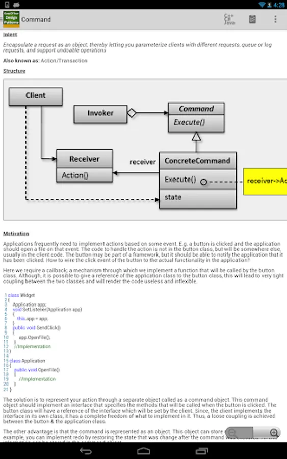 Each pattern is described in detail. The explanation is simple & lucid and acts as a quick tutorial & reference on your mobile phone. All the patterns have examples explained in three languages - C++, C# & Java. More languages coming soon!!!