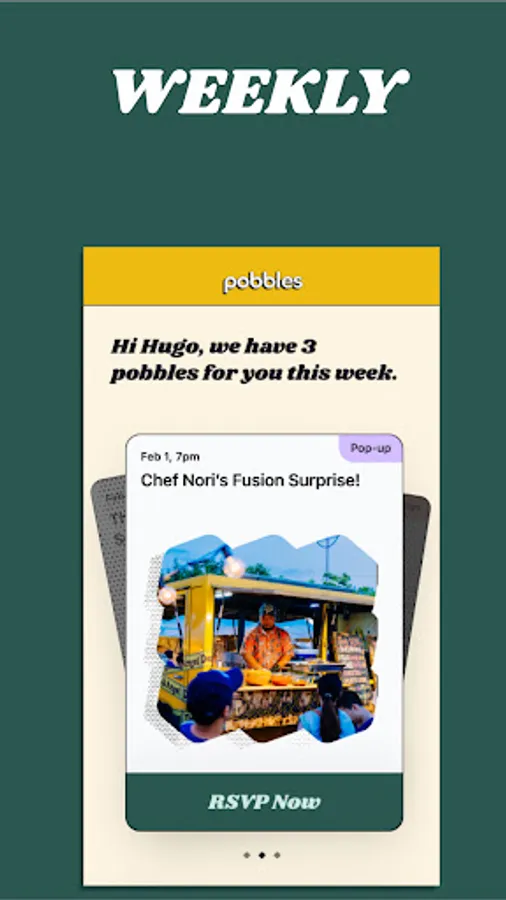 Pobbles is the simplest way to plug into the pulse of your city through local events. Enjoy new and fully curated recommendations of things happening all around you that you won’t want to miss. From trendy food pop-ups to limited edition art exhibits, secret warehouse parties to sound baths in a cathedral, it’s time to stop letting the hassle of event discovery prevent you from living your best life.