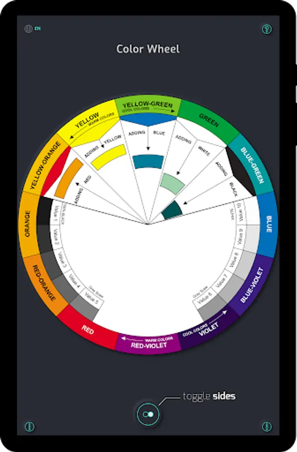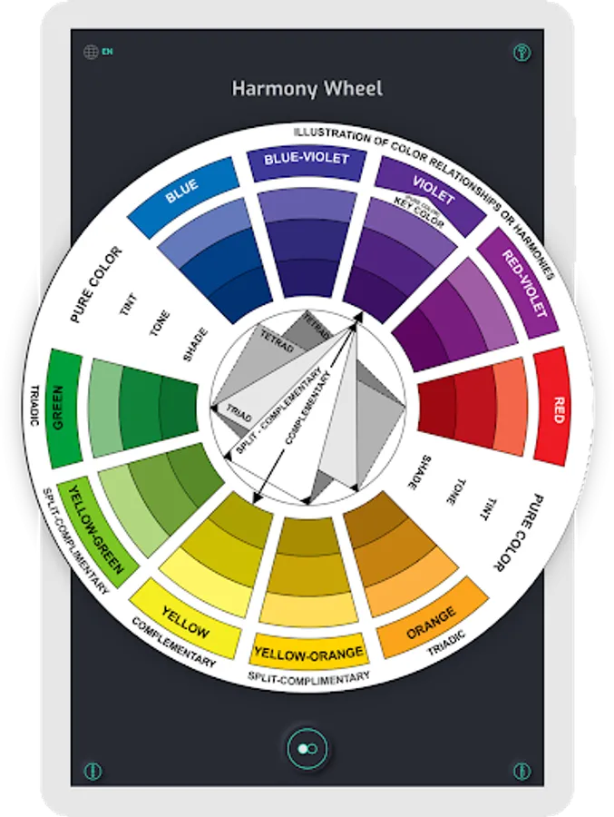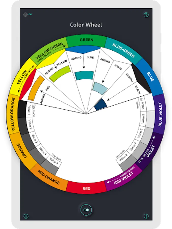 An indispensable reference for students, artists and designers, this Pocket Color Wheel app will help you master the basics of color theory. A visual guide to color mixing in a convenient app, it illustrates color relationships through a series of windows and color tones on a moveable wheel, and it provides you with information like color relationship harmony, complementary colors, tone variation and the triadic approach to colors. In addition to color relationships, tints, tones and shades, it also includes a gray scale and definitions of common terms.