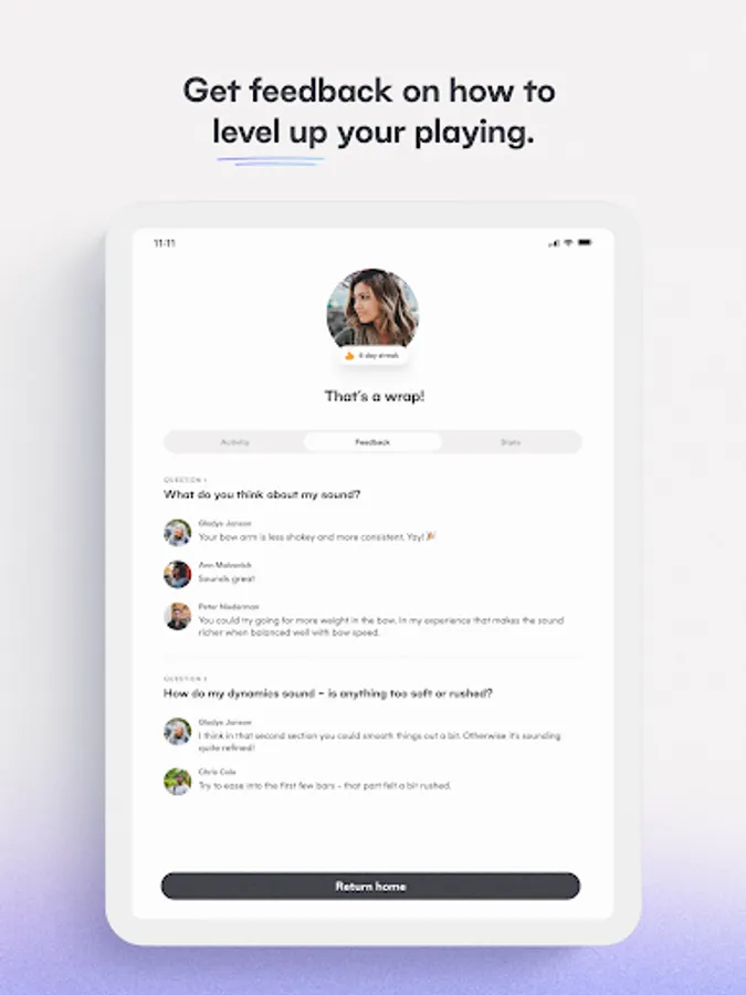 Tonic helps you stay committed on your learning journey. Whether you simply want feedback on a piece, or to join a community of musicians and get practice reminders to hold you accountable in between lessons, Tonic is simply here to help you learn your favorite instrument.