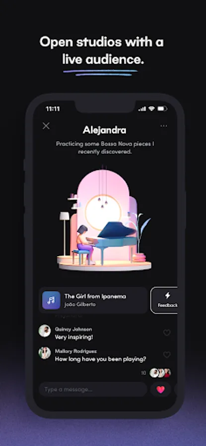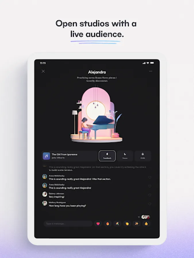 A space for musicians of all levels to meet up, practice together, and track personal progress. Share work-in-progress and celebrate moments of your artistic journey. Open a virtual practice room, meet new practice buddies, and upload practice videos to get feedback from your community.