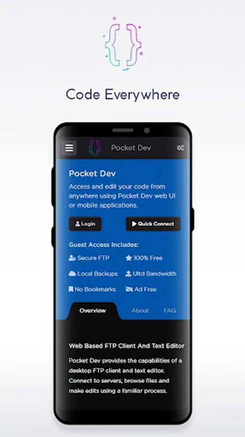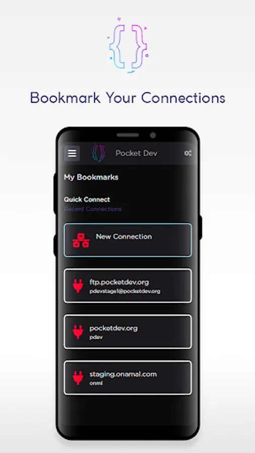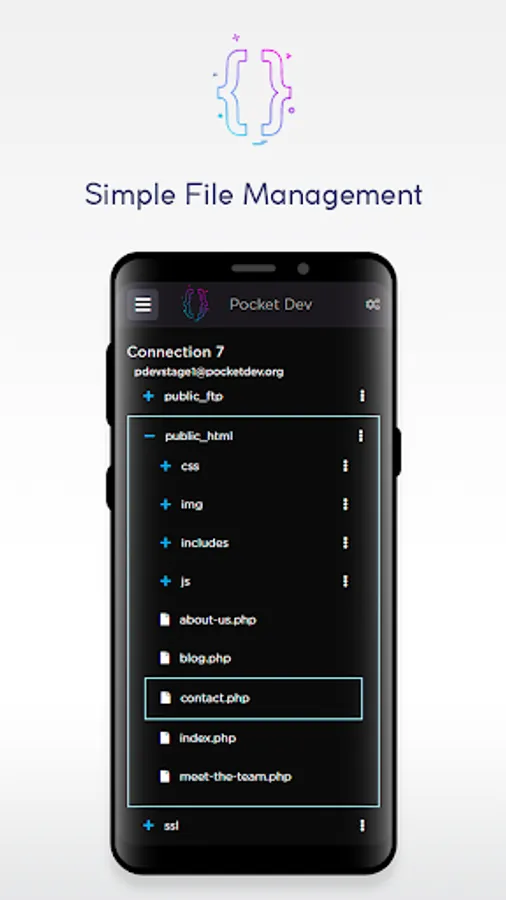 Connect and bookmark your frequently accessed servers to make them accessible across devices within your secure account. When connected, you will be able to browse, edit and rename files on your FTP server using your mobile device or web UI. Pocket Dev provides all of the capabilities you would expect from a desktop FTP client, accessible through the cloud.