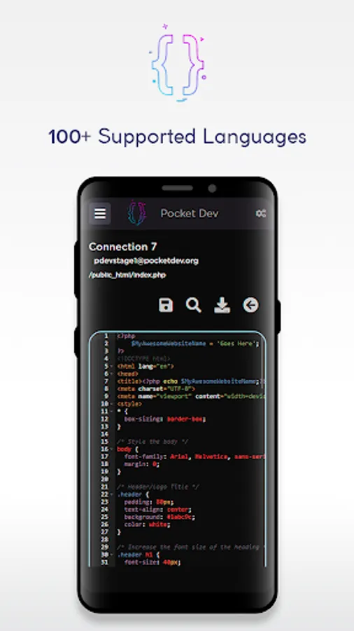 Edit your HTML, CSS, PHP and more. Built to help you code in over 100 languages, Pocket Dev offers a standard code editor experience with features such as syntax highlighting, line numbers and hotkey support. Our cloud editor works to streamline and deliver the most efficiency increases for the current device.