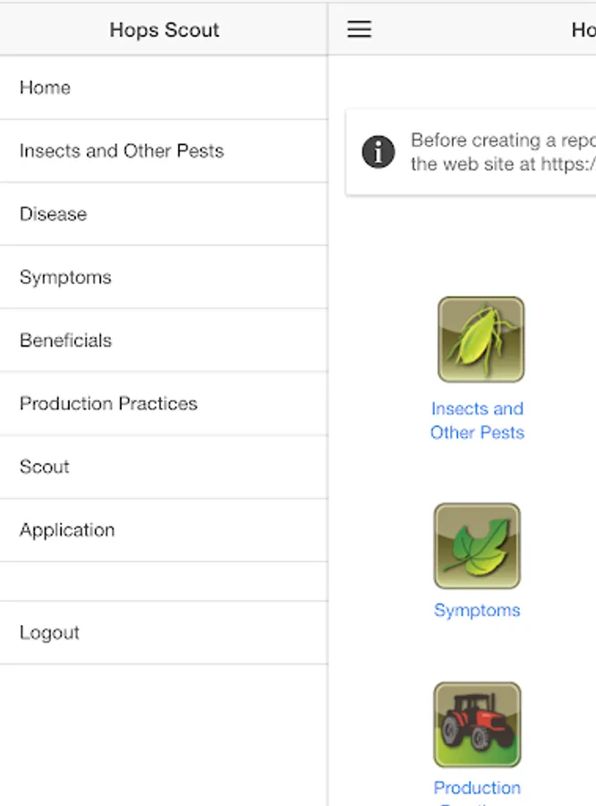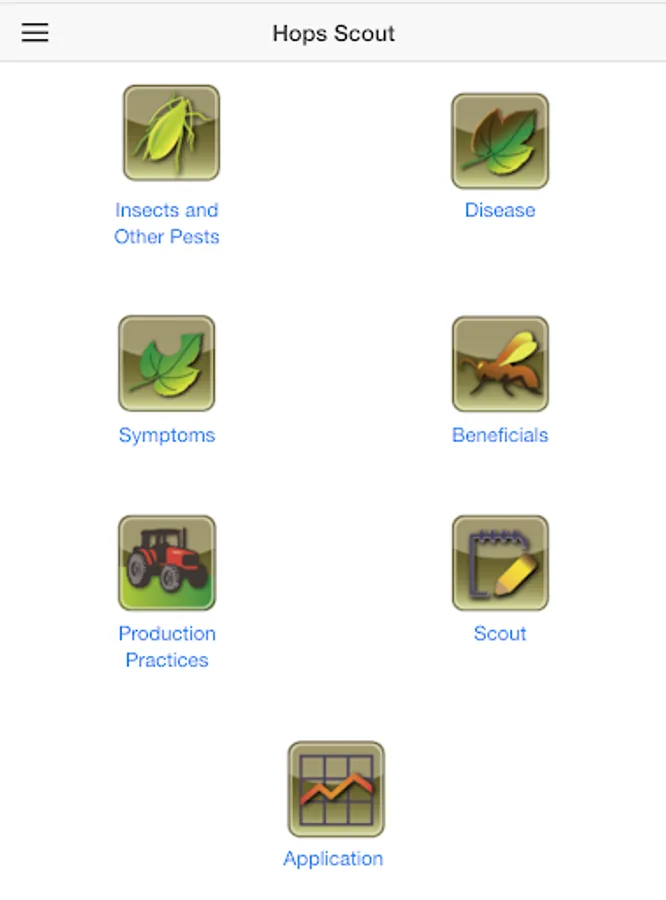 The Hops Scoutâ„¢ mobile application has been designed to provide an easily accessible summary of information on common hops pests and an interactive interface for collecting, organizing, and presenting scouting data and applications.