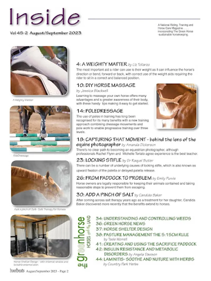 • An 8 page section entitled The Green Horse, the essential guide to sustainable horse keeping, pasture and property management, environmental issues, fencing, water and practical hands-on reader’s tips.