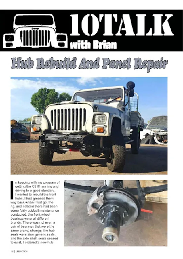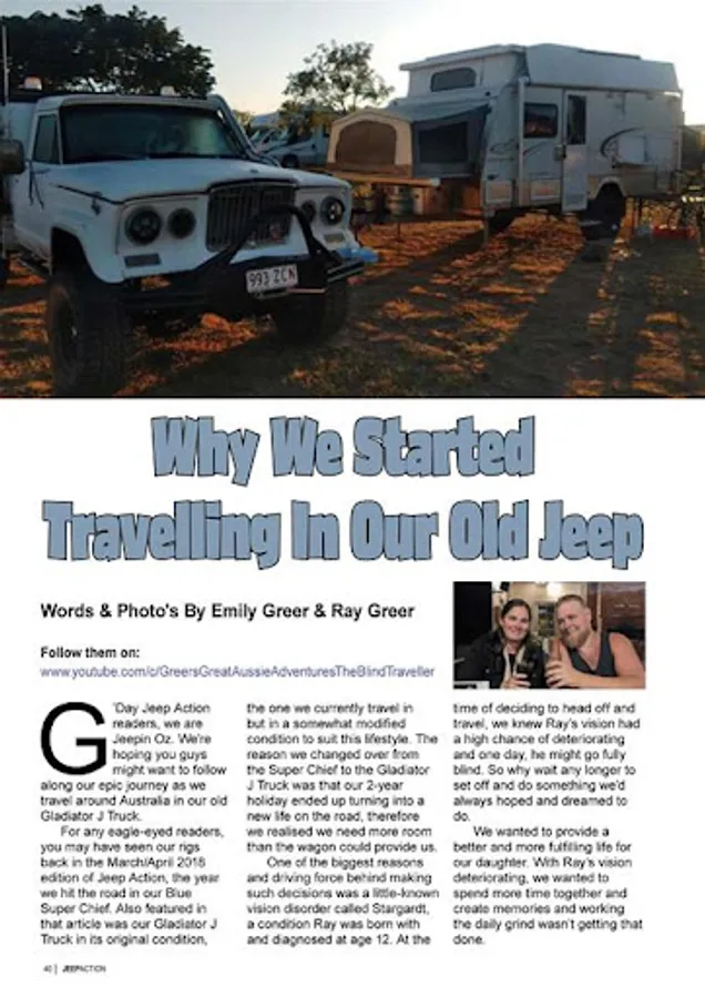 Jeep Action Magazine is a bi-monthly magazine for four-wheel drive enthusiasts and in particular, Jeep owners and prospective owners. It features articles on Jeep activities in Australia and from around the world. The magazine is an information resource for Jeep enthusiasts seeking parts, products and services for their vehicles and off-road adventures. Jeep Action Magazine is printed on gloss paper in full colour and is the only Jeep magazine published in Australia. Jeep Action features articles on Jeep history, owner profiles, trips, technical, Jeep builds, modifications and events.