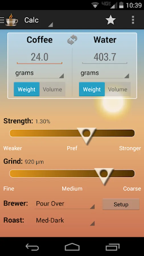 Automagically Calculates Brew Ratio: Getting the correct water to coffee ratio is something more complicated than you might expect other than by trial and error. Getting the correct amounts is even more critical for single serve brewers. Did you know that the brew ratio will change going from a drip brewer to a French press? Many other factors are built into the coffee extraction model used in CoffeeNotes.