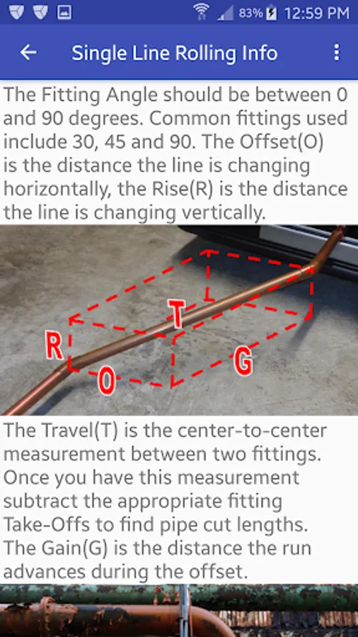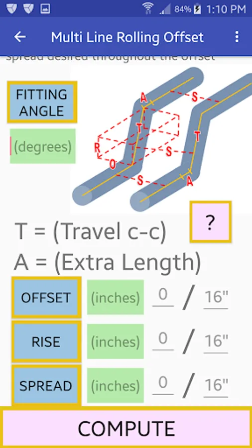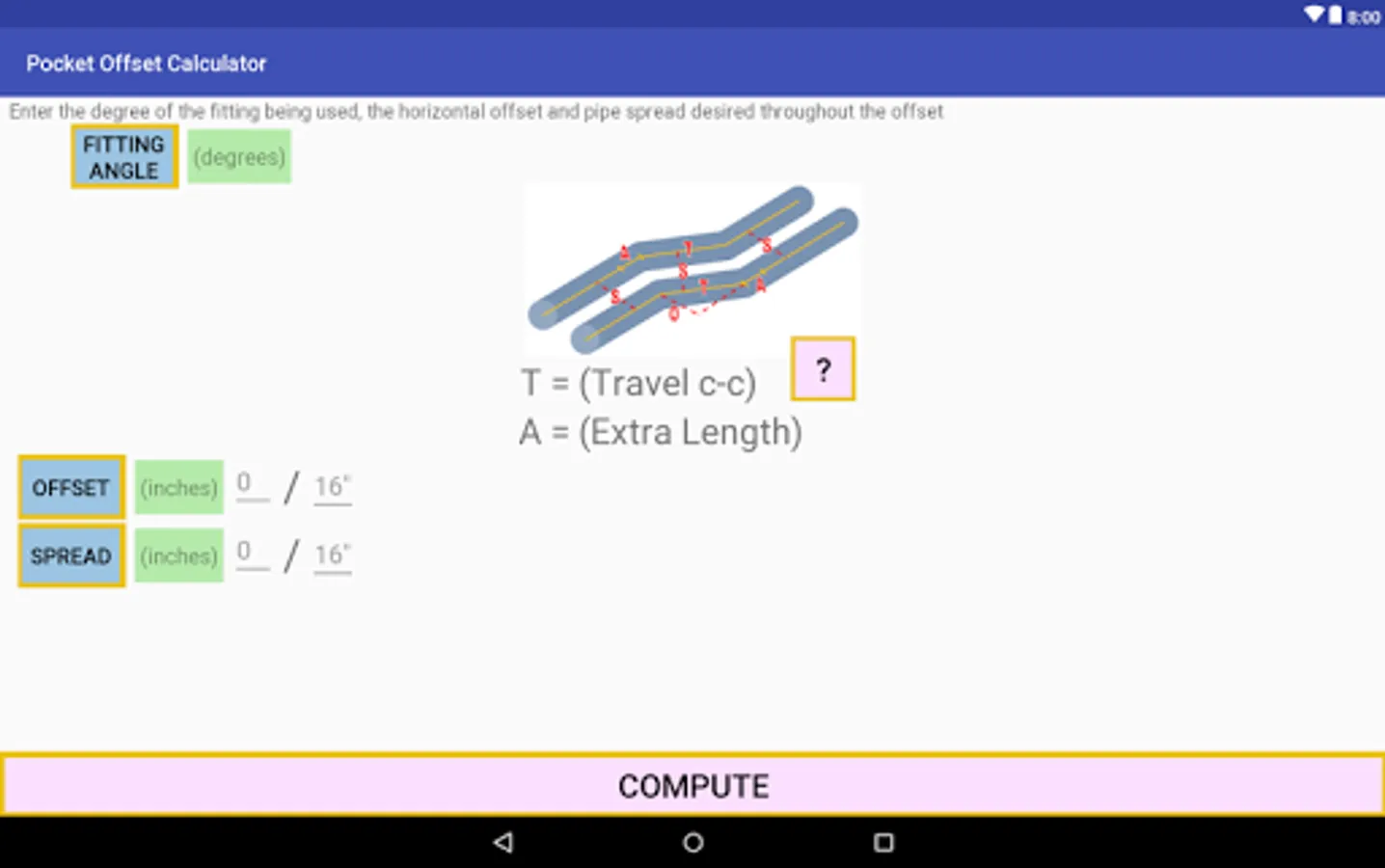 This app was developed by a Steamfitter with field use in mind. You can use any degree fitting angle you would like. Enter the known information for Offset, Rise, and Spread and receive the answers rounded to the nearest 1/16 of an inch or the nearest millimeter.