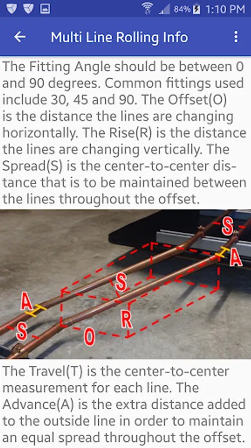 With the information the app provides you can build single pipe offsets and also parallel pipe offsets that maintain an equal center-to-center spread. Both single line and multi line offsets can be either flat(horizontal or vertical only) or rolling(horizontal and vertical changes).