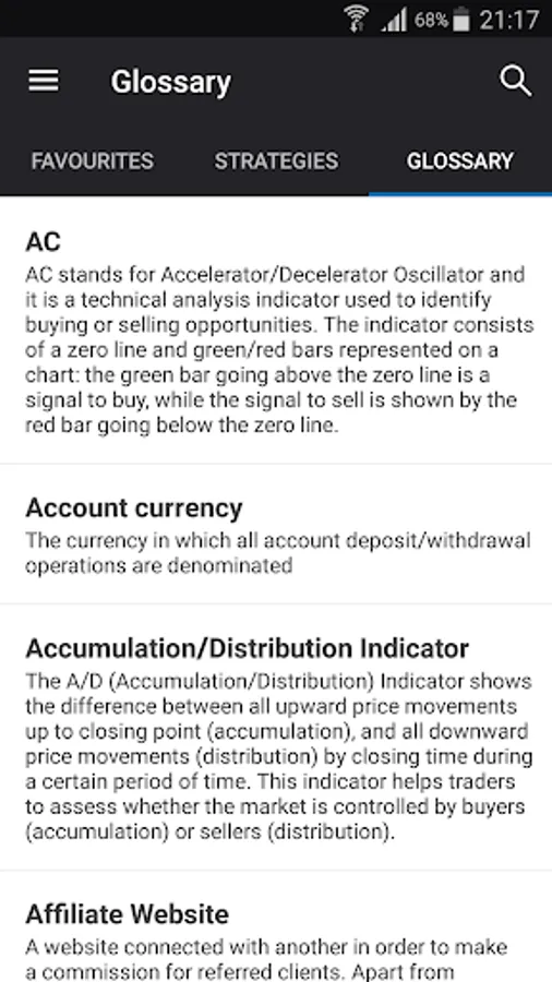 You don't know the name of an indicator or a chart? Our application has a Glossary, which contains clear definitions of all terms used in the FX market.