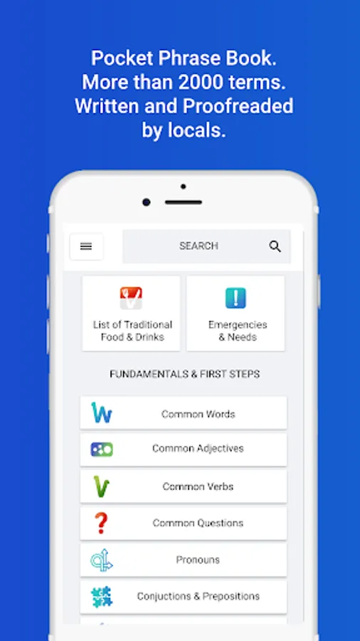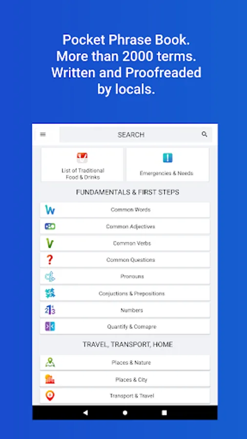- A dedicated section for Traditional Food and Drinks, and a dedicated word searches menu.