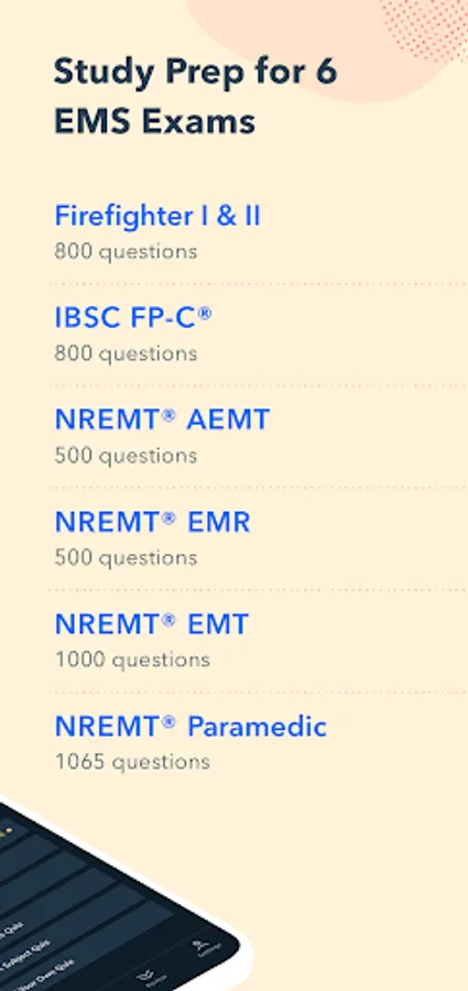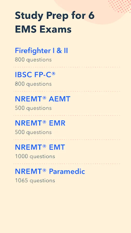 EMS Pocket Prep gives you access to study prep for 6 different emergency services exams all in one place, with 500-1000 practice questions for each exam.