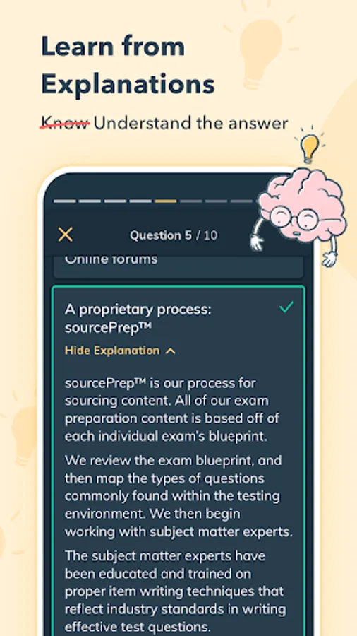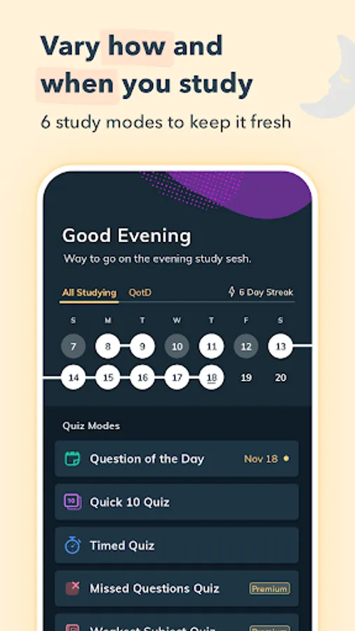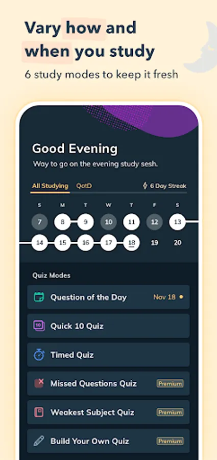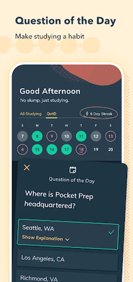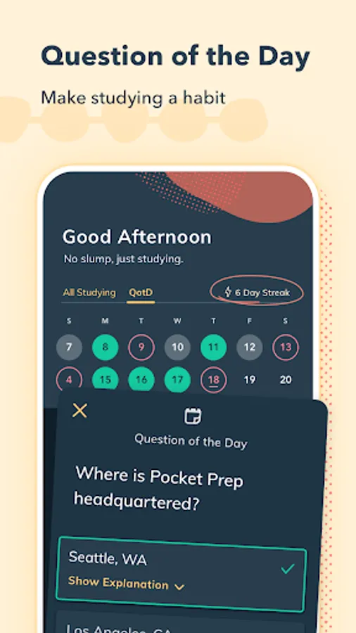 Scientific research shows that studying in short bursts over time is more effective than a handful of long study sessions. Our app is built with this in mind, giving you the power to study from your phone whenever and wherever it's convenient for you. Easily access practice questions while waiting in line, on public transit, on meal breaks, and more!