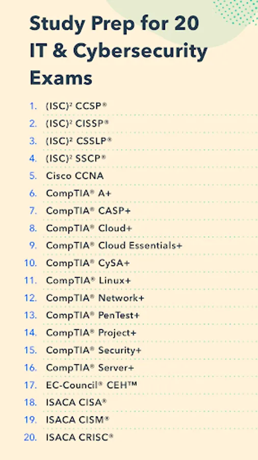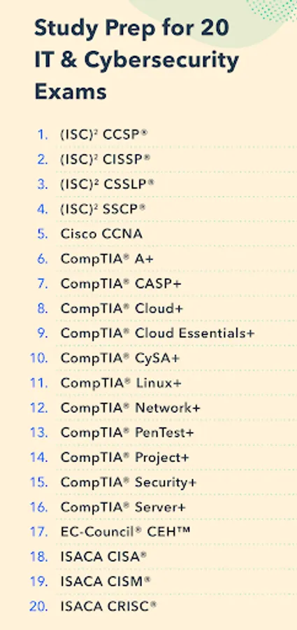IT & Cybersecurity Pocket Prep gives you access to study prep for 17 different IT & cybersecurity exams all in one place, with 500-1200 practice questions for each exam.