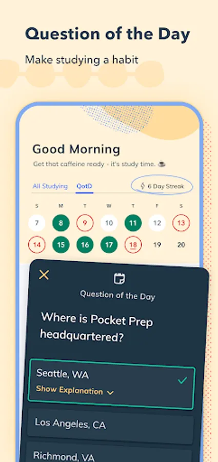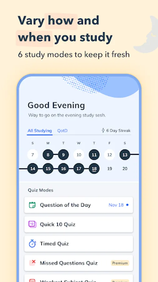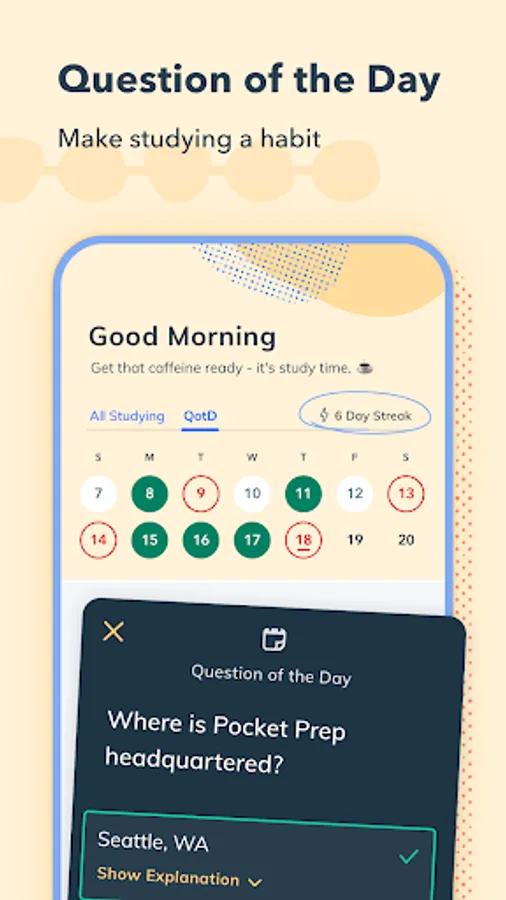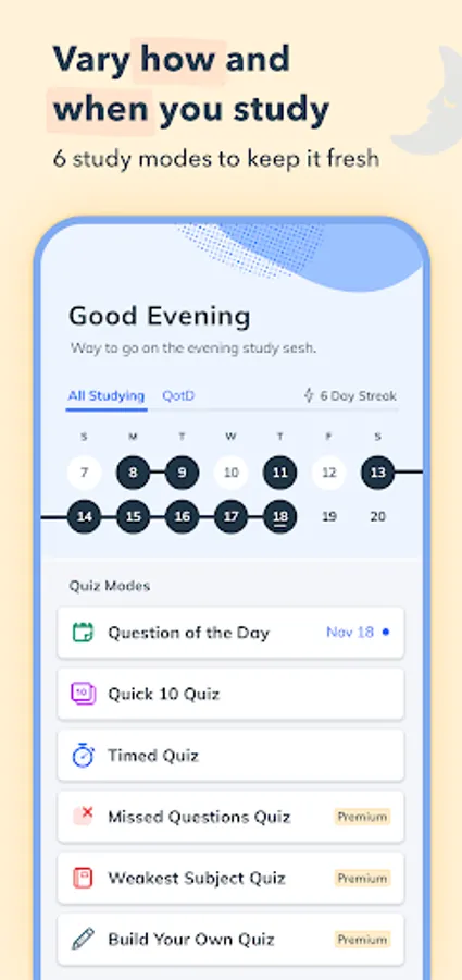 Scientific research shows that studying in short bursts over time is more effective than a handful of long study sessions. Our app is built with this in mind, giving you the power to study from your phone whenever and wherever it's convenient for you. Easily access practice questions while waiting in line, on public transit, on meal breaks, and more!