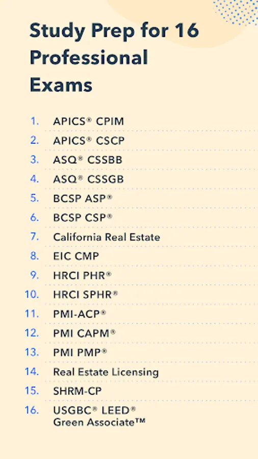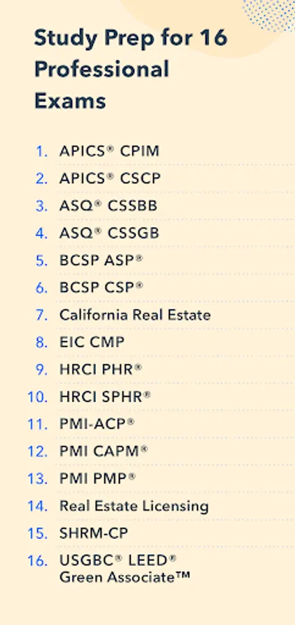 Professional Pocket Prep gives you access to study prep for 17 different professional exams all in one place, with 500-1600 practice questions for each exam.