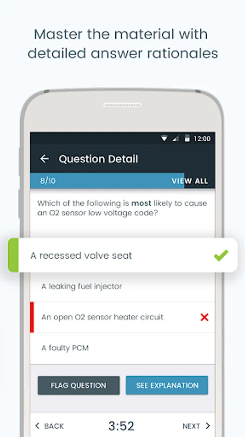 Pocket Prep’s ASE Advanced Engine Performance Specialist (L1) practice test app is a powerful exam simulator that allows you to create customized practice tests with detailed answer explanations for every question. View your results and exam history with just a few taps. Study anywhere at any time without Internet connectivity.