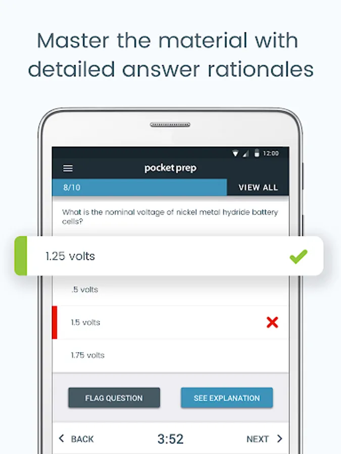 Pocket Prep’s ASE Light Duty Hybrid/Electric Vehicle Specialist (L3) practice test app is a powerful exam simulator that allows you to create customized practice tests with detailed answer explanations for every question. View your results and exam history with just a few taps. Study anywhere at any time without Internet connectivity.
